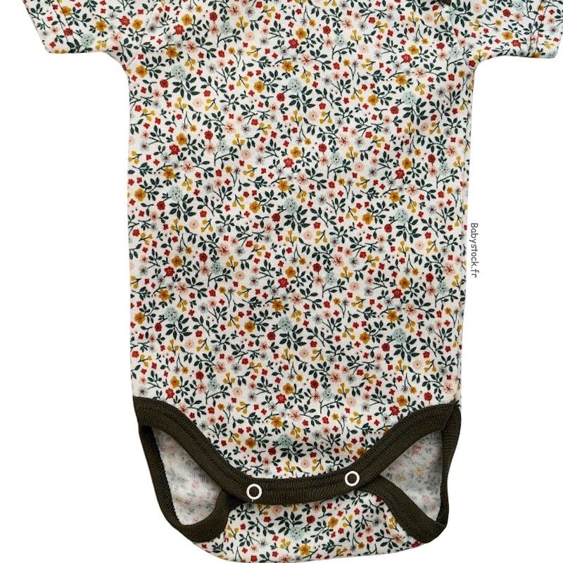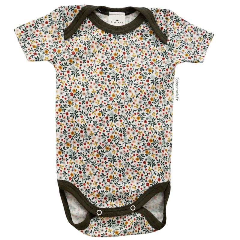 Body bébé fille à manches courtes imprimé fleurs et biais kaki