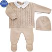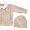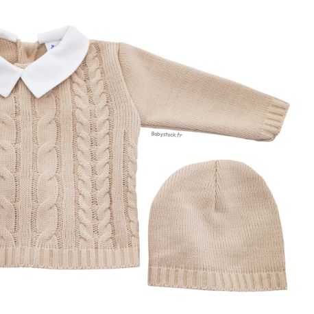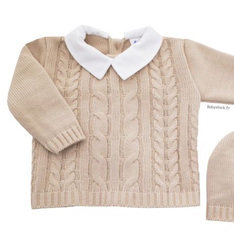 Ensemble garçon en maille torsades beige col piqué blanc 3 pièces