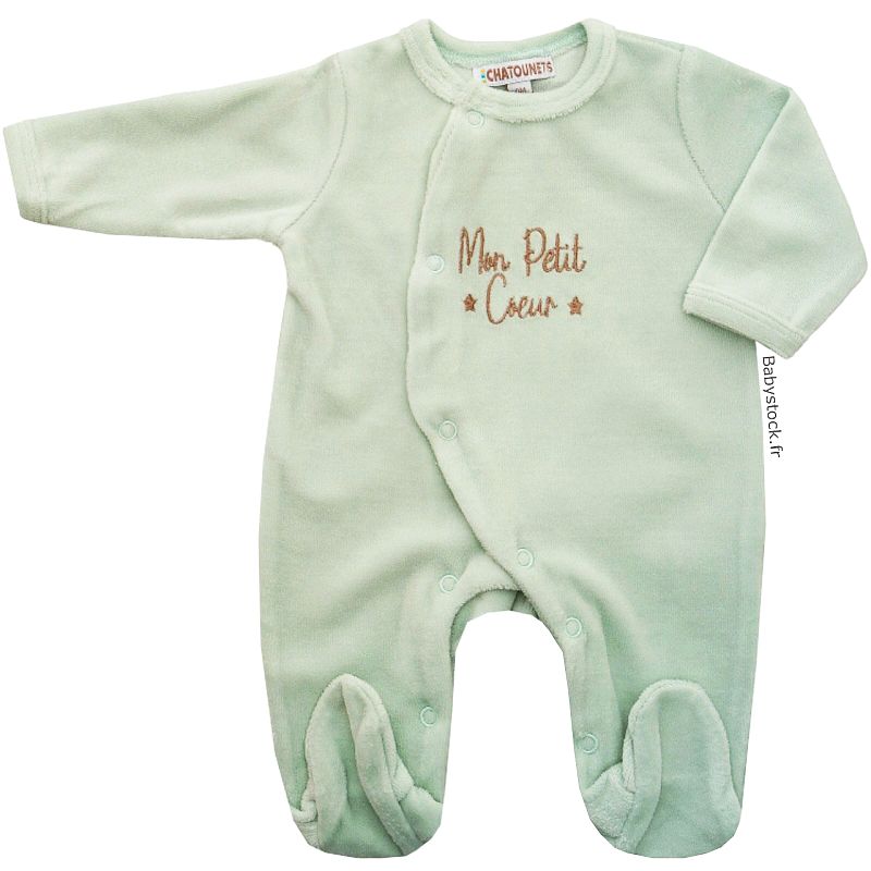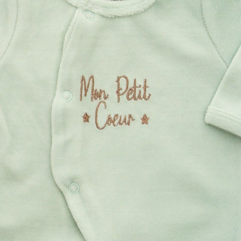 Pyjama dors bien unisexe en velours vert d'eau brodé Mon petit coeur
